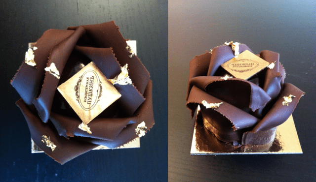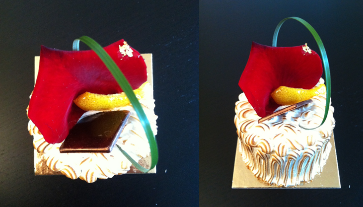 La Rose du Tsar (rien que ça!) (7.20€)Biscuit brownies chocolat, gelée de mure et jasmin, mousse chocolat or noir