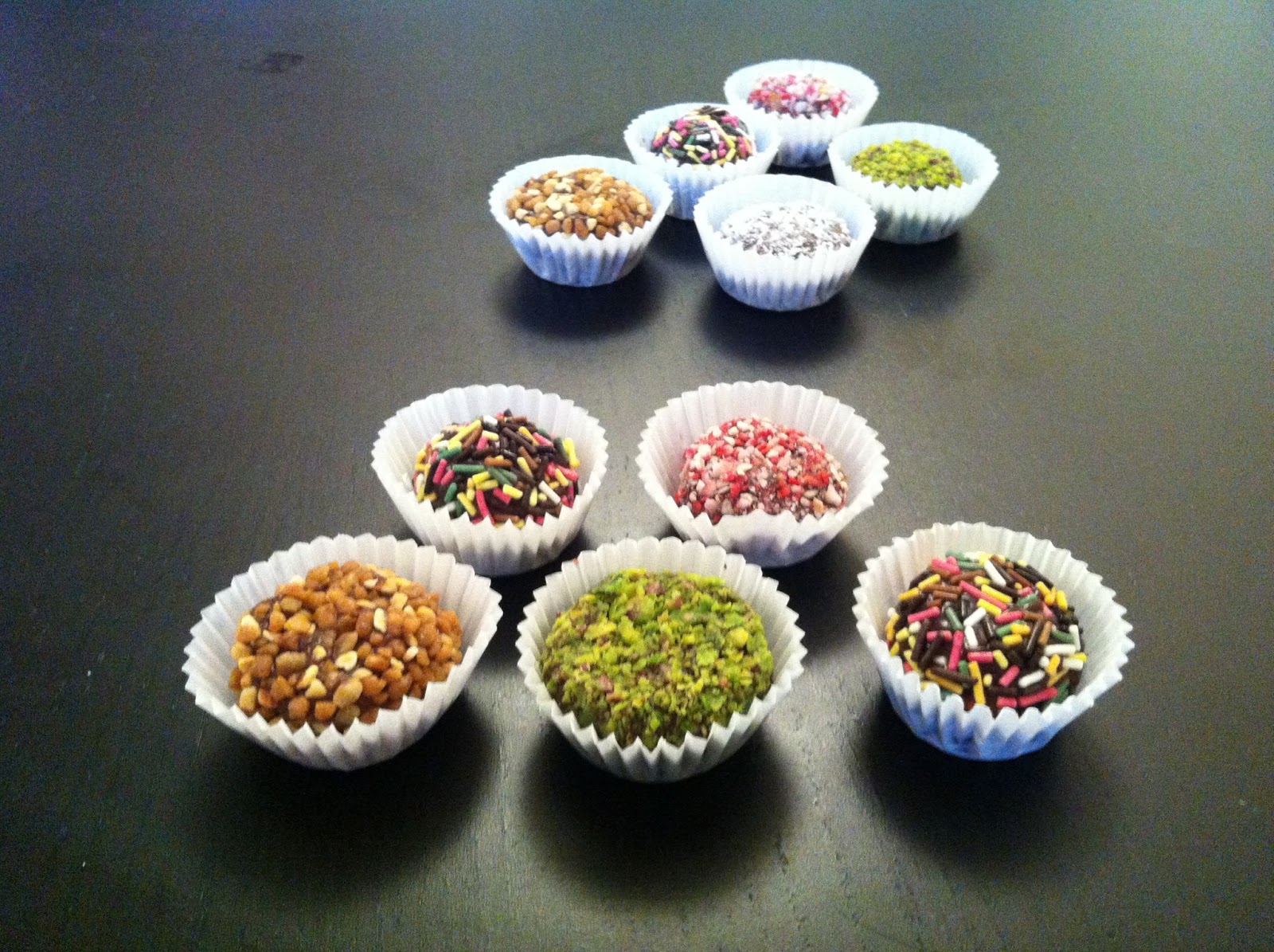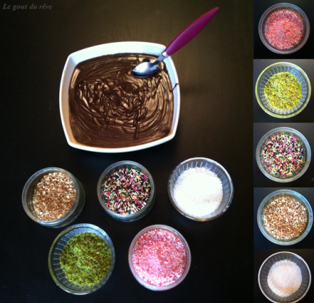 Des petits grains de couleurspour rouler vos brigadeiros. Moi j’ai utilisé (sur la photo à droite de haut en bas): de la poudre de praline rose/ de la poudre depistache/ desvermicelles multicolores/ du pralin/ de la poudre coco