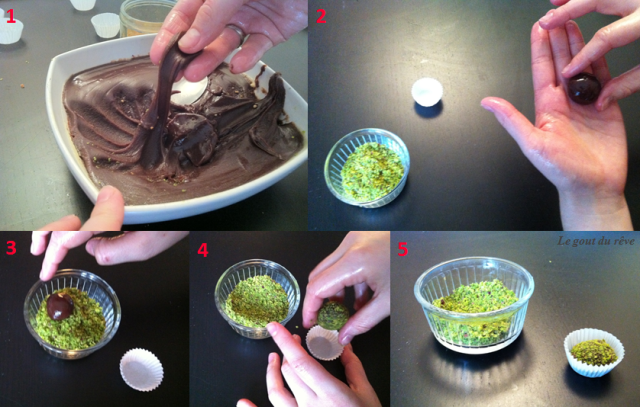 Et ensuite on suit les étapes ci-dessus: 1. on enduit ses doigts de beurre (^^ je ne vous ai pas dit que cette recette était faite pour les gens propres!) et on prend l’équivalent d’une noix de ganache dans ses mains. 2. On fait une petite boule.3. On la trempe dans la poudre. 4. On met sa jolie petite boule dans une petite caissette. 5. Une fois que c’est fini vous pouvez réserver vos Brigadeiros au frais !