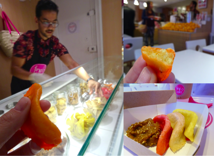 Nous choisissons de goûter plusieurs cornes de gazelle, ici elles sont déclinées en plusieurs parfums – originale, framboise, citron et orange- ainsi que le Mkharka – au miel et sésame.