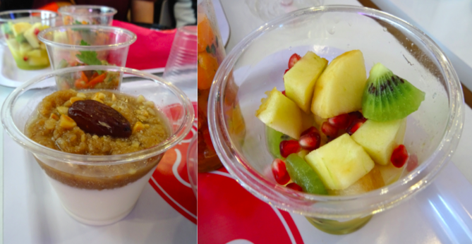 Nous passons au dessert avec un fromage blanc au coulis de dattes et une salade de fruits frais à la fleur d’oranger. C’est frais et on retrouve bien les marqueurs de la cuisine marocaine à savoir ici la fleur d’oranger et les dattes.