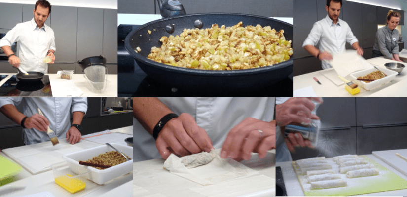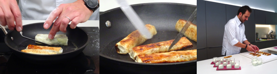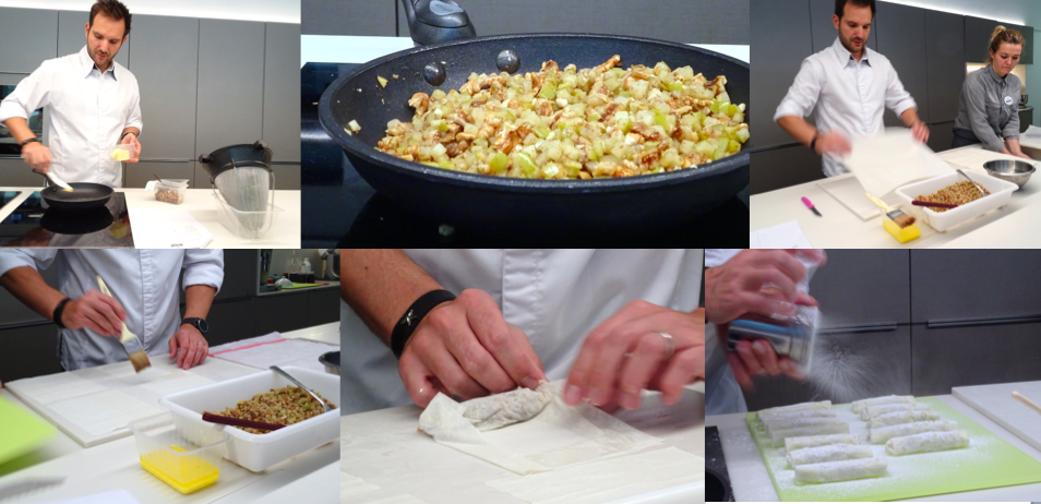 La préparation principale se constitue de pommes, figues et noix en morceaux assaisonnées à la vanille et fève de tonka. Nous roulons ensuite cette préparation dans de la pâte filo afin de constituer les nems que l’on fait finalement dorer à la poêle.