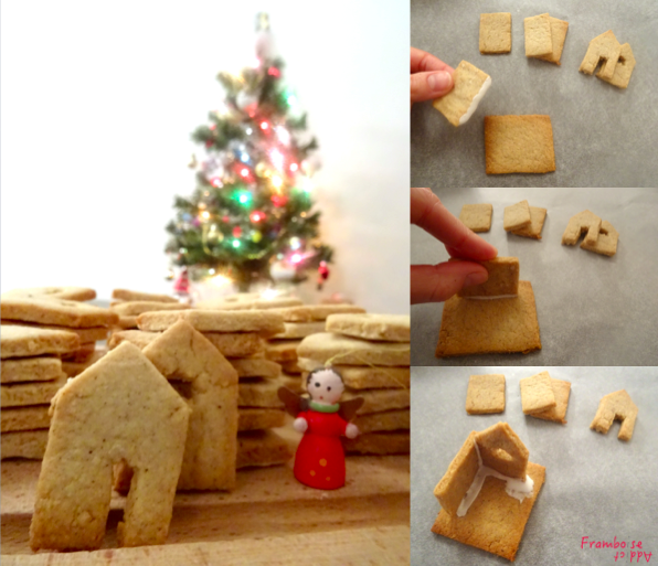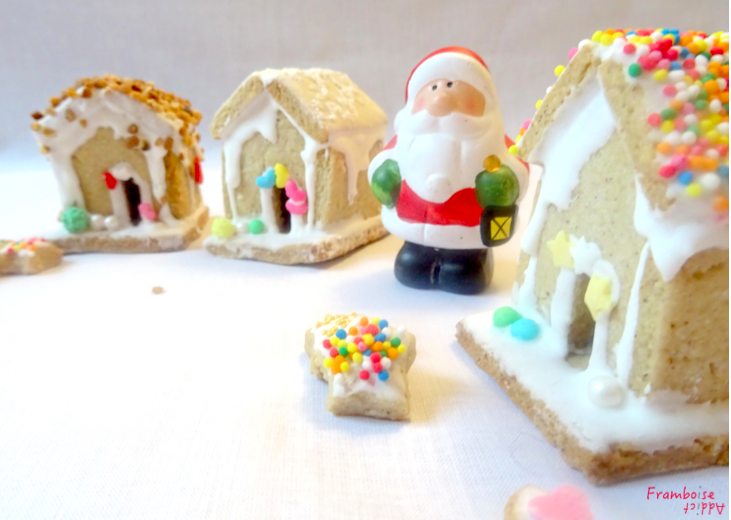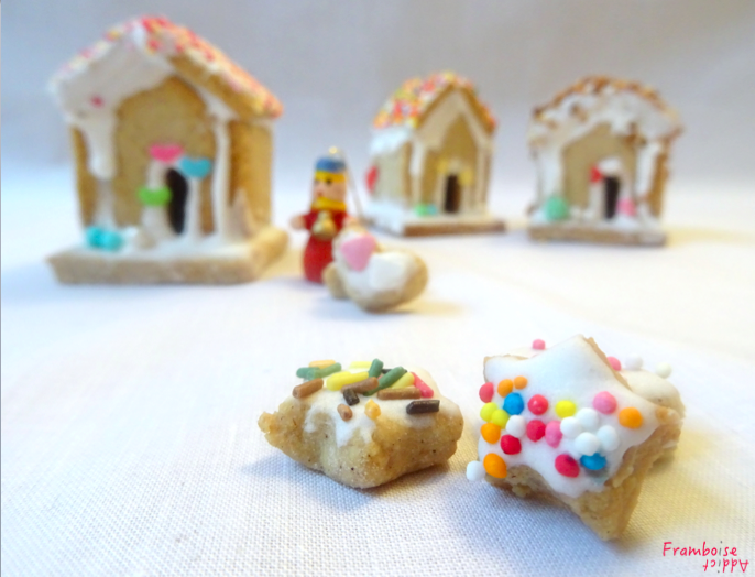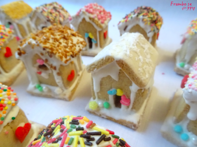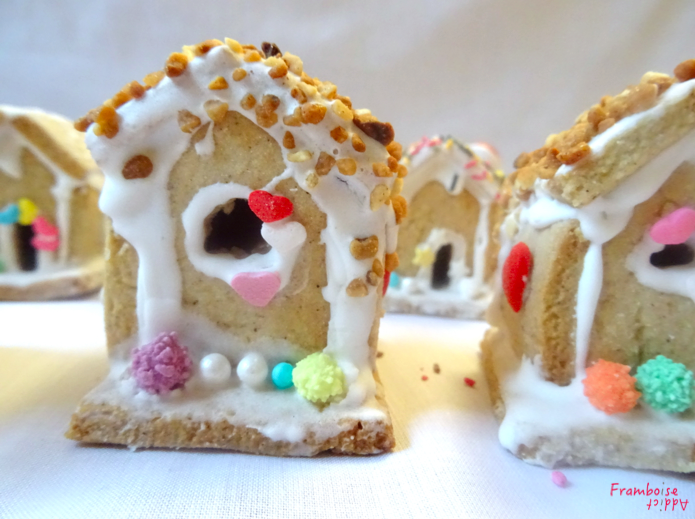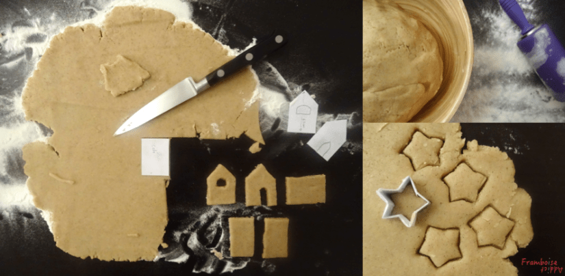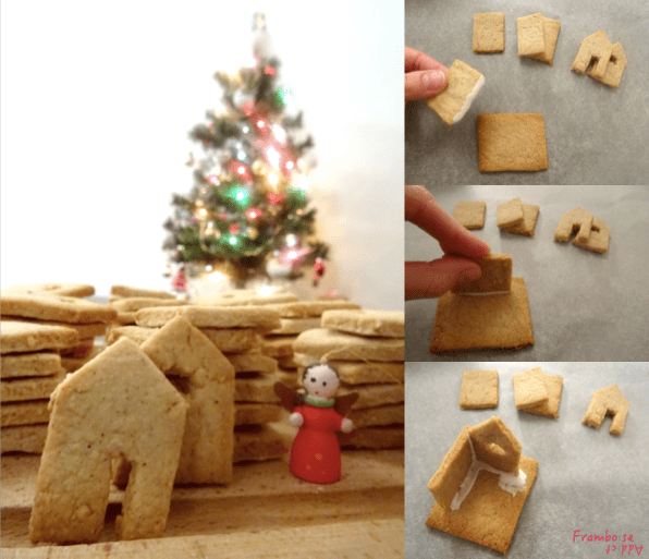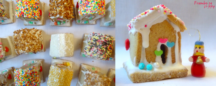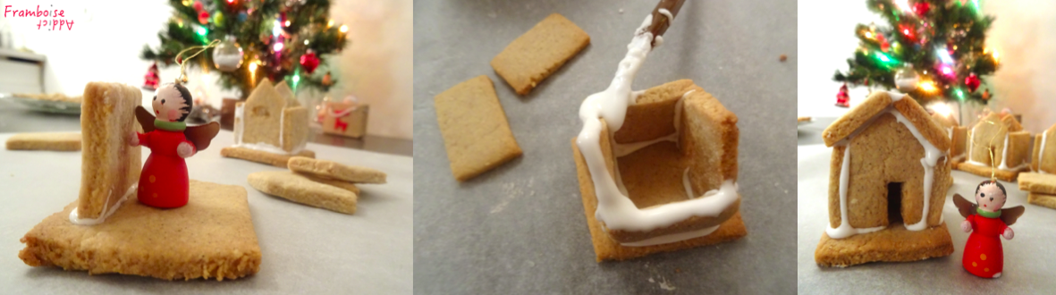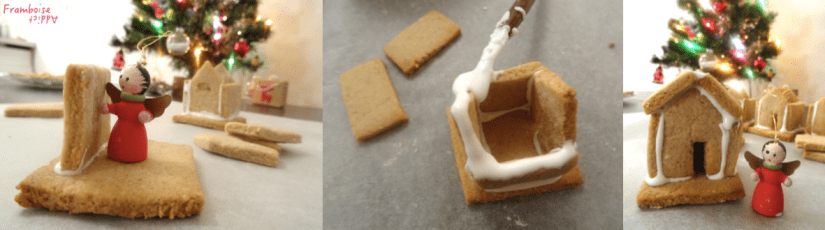 Une fois que vos biscuits sont cuits vous pouvez passer à l’assemblage ! Pour commencer il vous faut la recette du glaçage qui figure avec celle des biscuits (1 blanc d’oeuf/ 125g de sucre glace). Ce glaçage va vous servir de ciment pour coller les murs de la maison entre eux. Astuce: pour un ciment à prise rapide vous pouvez rajouter à la recette une cuillère à café de poudre de tartre alimentaire, mais sans le tartre ça marche très bien aussi 🙂