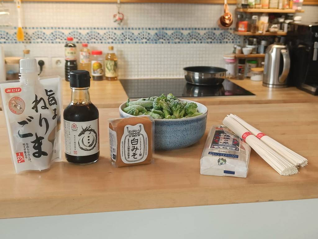 200g de pâtes sômen / 2 cuillères à soupe de sauce Soja / 4 cuillères à soupe de pâte de sésame / 3 cuillère à soupe de miso blanc / graines de sésame dorées / des légumes verts (j’ai toujours une version au congélateur) / 1 verre d’eau plein (70ml)