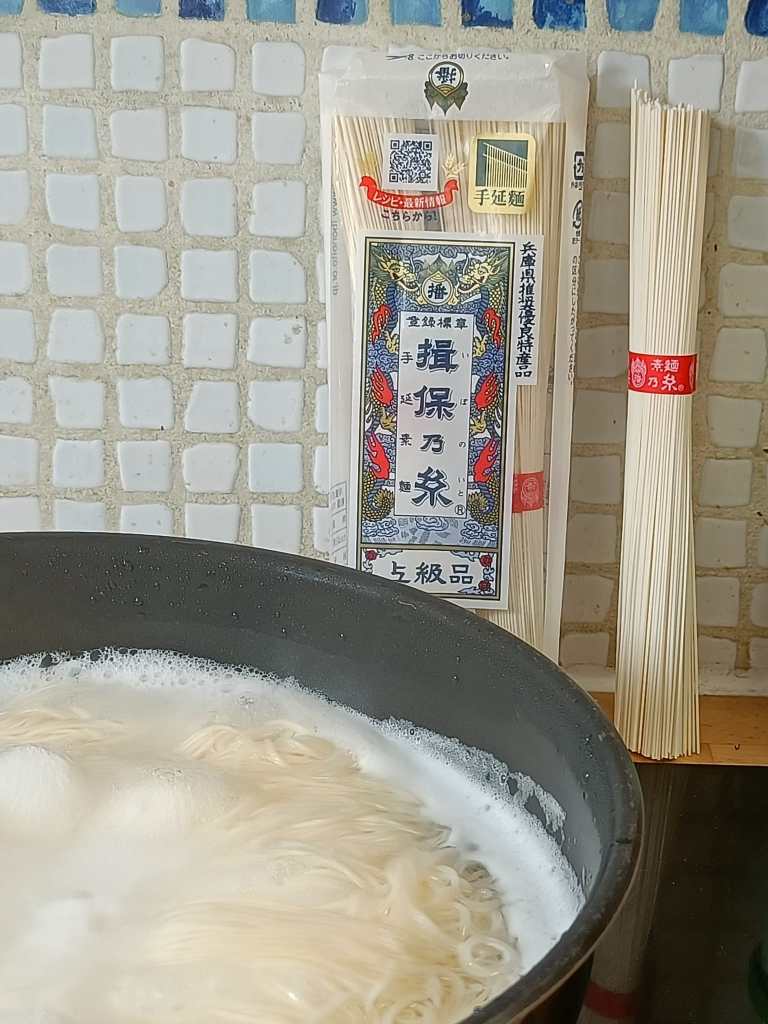 On fait cuire les nouilles somen 2minutes dans l’eau bouillante. On les égoutte et on les rince à l’eau froide (c’est important le resultat est bien meilleur)